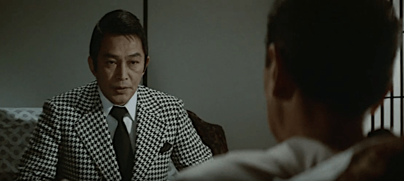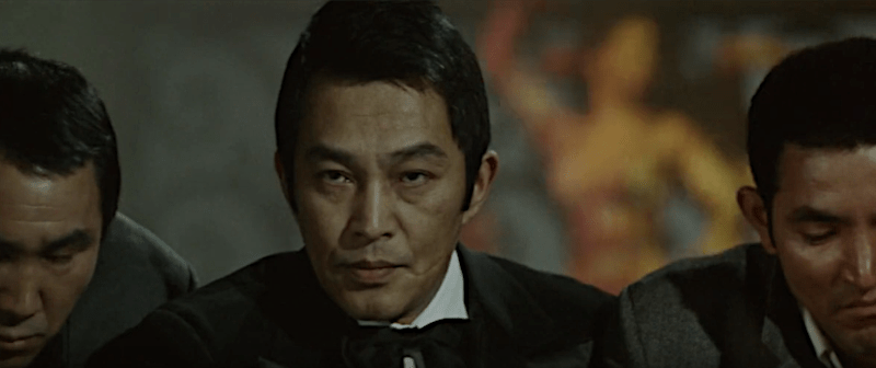 Perhaps the only relationship with some semblance of consistent authenticity is the alliance between Egawa and Tatsu, the go-with-the-flow gun dealer played by Bunta Sugawara. That Egawa seeks out his help so late in the story and just before the film’s bloody climax suggests a certain level of longstanding trust between them, and equal parts desperation from Egawa. Tatsu even comes along for the ride (literally) as Egawa drives a car through the front entrance of a Togiku cocktail party to stage his revolt against his former bosses. As screams and gunfire erupt all around them, Tatsu casually pokes his head up from the backseat every now and then to fire a shotgun at enemies while alternately napping, drinking a bottle of Coke, or eating (and wearing comically large headphones all the while and listening to who-the-hell-knows-what).