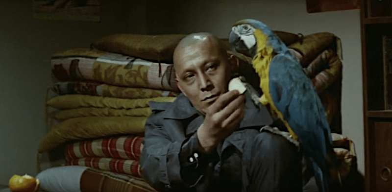 Of all these underworld characters – and there are a lot of them – few are more memorable than the pair of enforcers doing Gohara’s bidding in a string of assassinations. One is a straight-razor-wielding trans woman played by Madame Joy, the other is a menacing bald man with thin eyebrows and a colorful macaw perched on his shoulder (Shohei Yamamoto). This same pair of performers made another appearance as equally wild baddies in Toei’s wacky SISTER STREET FIGHTER: HANGING BY A THREAD, released the same year and also co-written by Kakefuda.