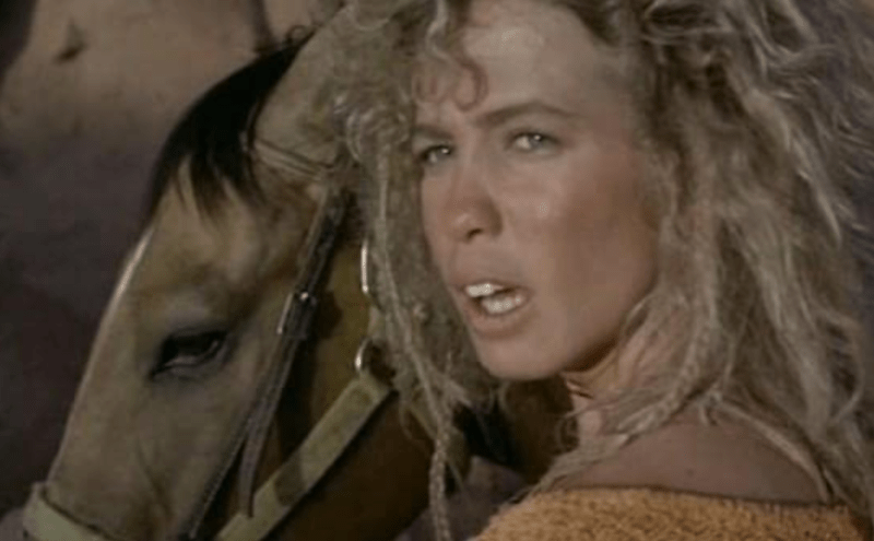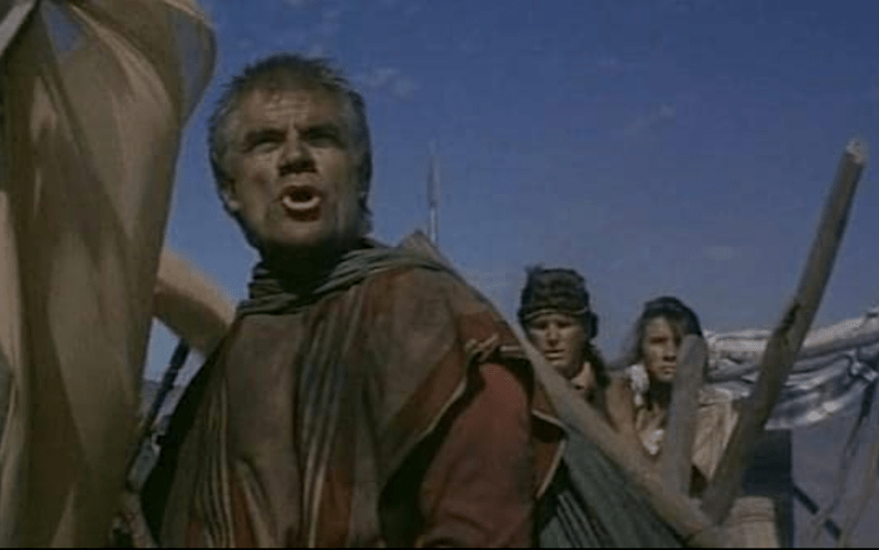 During one such raid years later, the now-adult Nea is shot with an arrow by human mercenaries and left to the cyborg, Simon (Scott Paulin), a lackey of Job. However, a hooded rider (Kris Kristofferson) appears on the horizon and immediately takes out a group of bandits before settings his sights on Simon. After disposing of the wise-cracking cyborg and then getting Nea to safety, we learn that this savior, Gabriel, is also a cyborg, albeit programmed with an entirely different objective: destroy the other cyborgs within his one year life-cycle. Following training that will show her the cyborgs’ strengths and vulnerabilities, Nea is going to help him do just that.