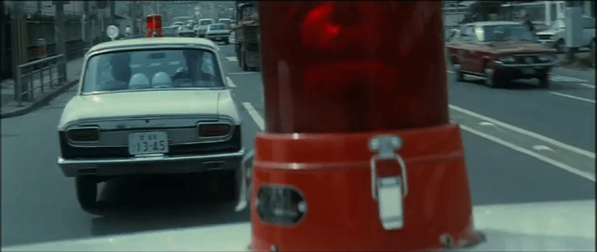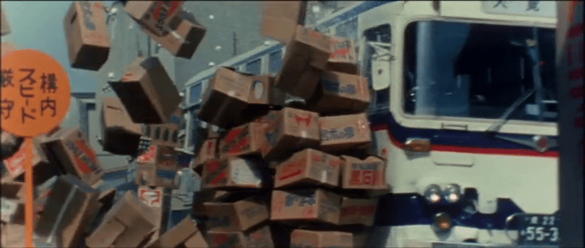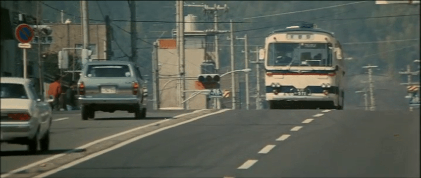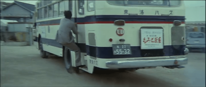 At a café inside a city bus station, the alluring, feather-haired Fumiko (Masako Araki) is having a lively conversation on the house phone, and the tone is urgent. Through the ambient chatter among customers, we learn that there’s been a bank robbery nearby. Around the same time, a municipal bus destined for Kyoto cruises through its daily route to the soundtrack of a jaunty jazz tune. As the driver makes each stop, folks depart and new riders board for travel; these are regular people going through the paces of their usual commute. Based on the limited amount of visual information we have up to this point, a bus will surely be involved.