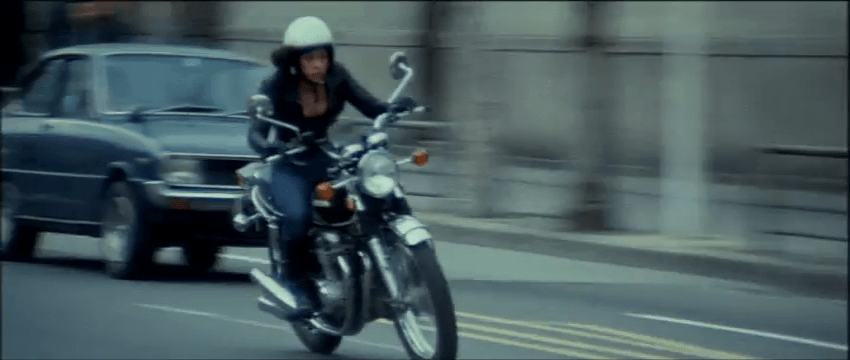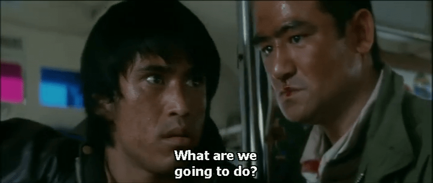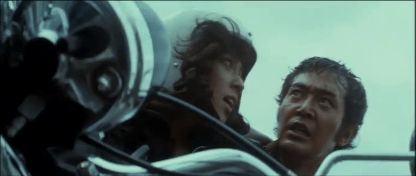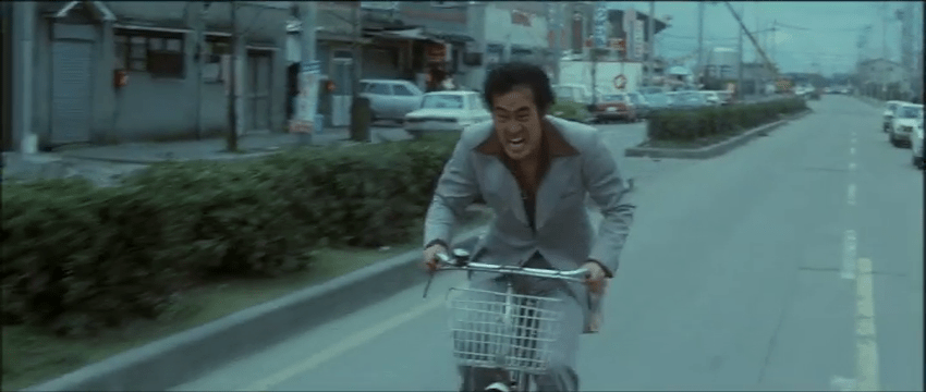 As if this mix of elements wasn’t combustible enough, the coolest customer on the bus sitting all the way in the back row is Shin (Tsunehiko Watase), a handsome stranger wielding a mysterious instrument case and a steely disposition. When robber, Toshio (Ryuji Katagiri), holds a knife to the driver’s throat, Shin doesn’t flinch. He stays on the level when other riders argue with the robbers that they’re missing appointments, and when children are screaming, and when one especially frantic woman screams “I FORGOT TO TURN OFF THE STOVE!” He even sits on the sideline when two male passengers jump the robbers in a bloody brawl that reveals that the other robber, Sabu (Takuzo Kawatani), has been brandishing an unloaded gun. When the bus stops just long enough for Toshio to switch the bus’s license plate, Shin finally makes his move and escapes the bus. However, his instrument case gets stuck in the door and the bus drives off leaving Shin behind. It’s at this point that we see a flicker of emotion turn into a determined rage as Shin gives chase … on a bicycle. (Even against a lurching bus, it’s a poor choice in transportation). The reasons for his tenacity come into focus as we learn more of his background and why the instrument case is so critical. But even if he makes it back to the bus: what then?