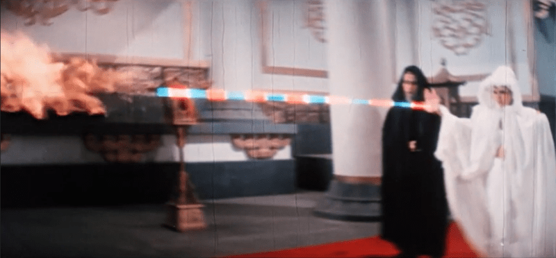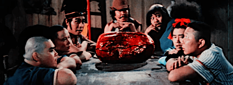 The conclusion to the 19th century fairy tale, SNOW WHITE, as written by the Brothers Grimm, features the wicked stepmother crashing the wedding of her stepdaughter, Snow-White, and the handsome prince, only to be forced by the groom to wear red-hot iron shoes and dance until she drops dead of exhaustion. It’s awkward enough to dance by yourself at a social function – one person’s dance of passion is another person’s full-body dry-heave set to music – but it’s even worse to wear scalding footwear while doing so, and totally ruthless to do it to death (for perspective, the Guinness World Record for the longest dance by an individual is more than 120 hours). As a loose adaptation of the aforementioned fairy tale, the 1981 Taiwanese film, THRILLING BLOODY SWORD, doesn’t feature any abuse quite so cruel or protracted, but it does have ominous cave lighting and a character with a head shaped like a butt.