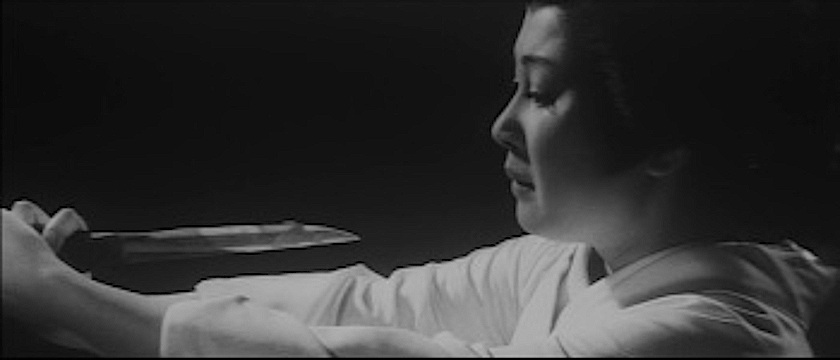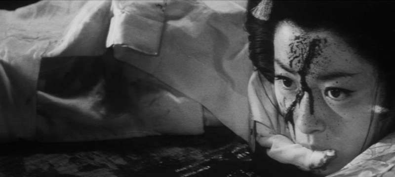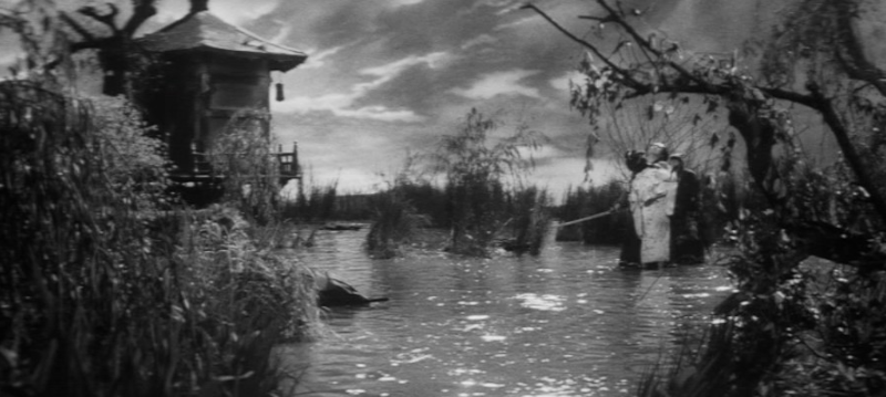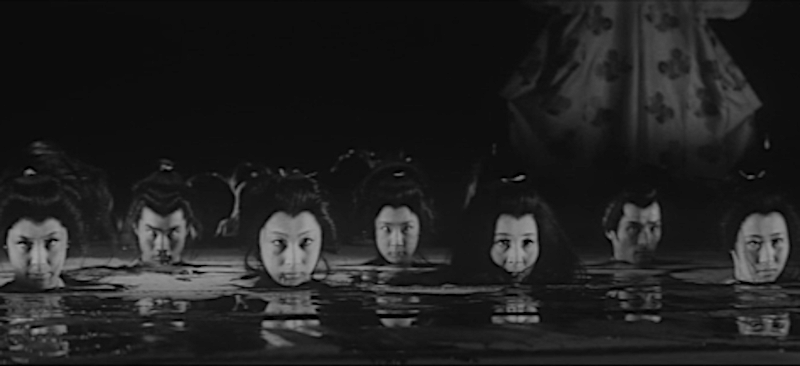 Ishikawa had more credits as writer or assistant director in a film career that, intentional or not, he book-ended with two ghost-cat films, but he’s a steady hand with a strong sense of both style and vision. While a good portion of the story occurs indoors, Ishikawa makes good use of his exteriors by staging multiple sword-fights with well-paced action, including one sequence where Jonosuke fights off a steady barrage of attackers while traversing through a drainage ditch. The cursed swamp is the most pivotal outdoor location of all, and through the change of the tone of the music and sudden shifts in character demeanor as they become aware of their surroundings, it feels suitably menacing. (Lots of fog helps too). The film offers really solid production design all around.