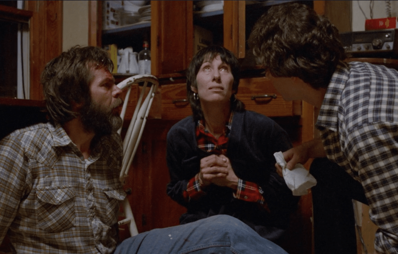 After breakfast, as Gary cleans and field dresses his morning kill in their front yard, a car full of Helen’s college-aged children (from a prior marriage) pulls up to visit for the Christmas holiday. Still covered in viscera and the stench of death along with whatever residual odors an all-bran breakfast may have left behind, Gary greets Dolly (Dana Day) and Ted (James Fitzgibbons) like his very own kin. Visiting this place for the very first time is Sarah (Claudia Peyton), Ted’s girlfriend. Upon hearing the ruckus of their arrival outside, Helen appears at the doorway and greets her two children with joy; when she exchanges pleasantries with Sarah, something is deeply wrong for both of them. Underscoring the weirdness is that Helen purchased a Christmas gift for her despite not knowing that her son had a girlfriend at all.